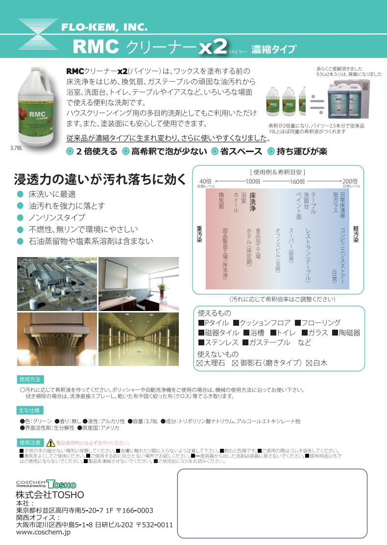 トップページ > 業務用洗剤関連 > 業務用洗剤(床用・万能洗剤・特殊洗剤・その他洗剤) > 濃縮タイプに改良!浸透力の違いが汚れ落ちに効く!TOSHO RMCクリーナー×2(バイツー)3.78L