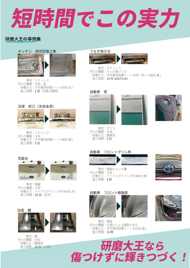 一般的に錆や汚れの除去は下地に傷がつく場合が多いですが、研磨大王は素材を傷つけにくい仕様となっているため、錆や汚れの除去と同時に下地の光沢度を上げることが可能です。④幅広い対象素材