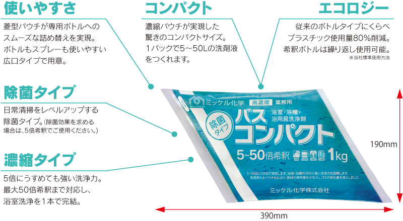 トップページ > 業務用洗剤関連 > バスクリーナー・バス洗剤用具 > ミッケル化学 バスコンパクト1kg(最大50倍希釈まで対応!パウチタイプ高濃度浴室用中性洗剤)