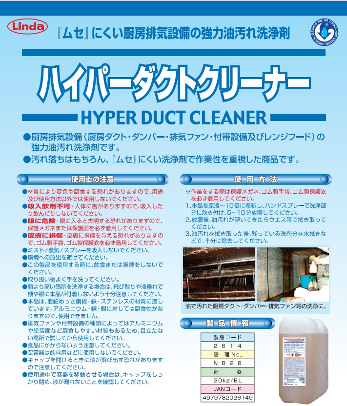 トップページ > 業務用洗剤関連 > 厨房用(動植物)油汚れ洗剤 > リンダ ハイパーダクトクリーナー20kg