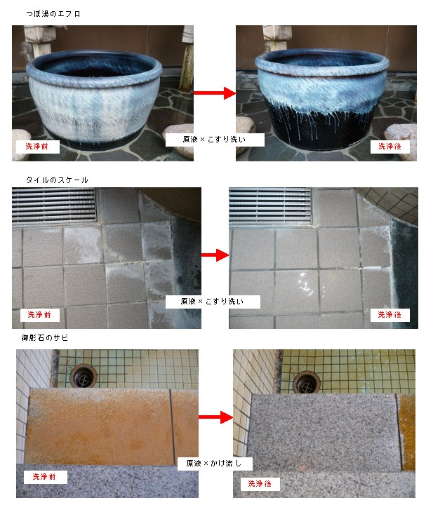 ・床面のエフロ、湯の華などの除去、排水管のスケール除去、浴槽循環配管のスケール除去、トイレの尿石除去
